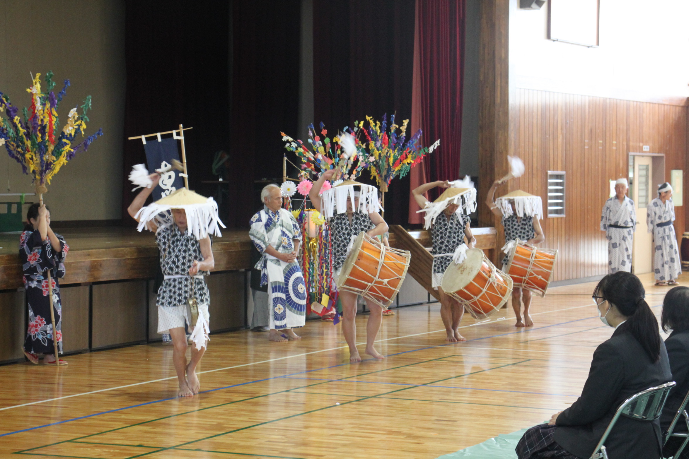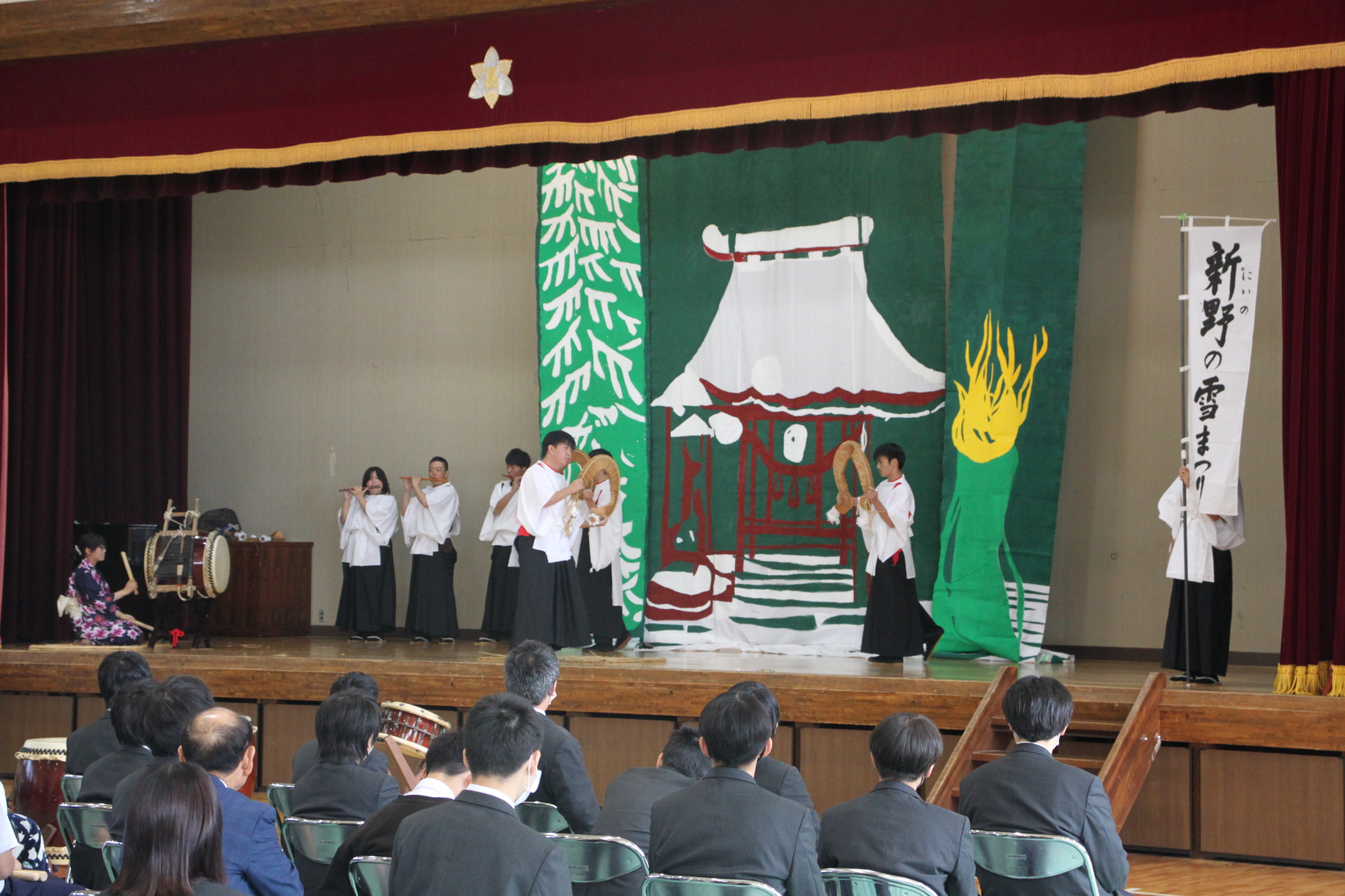 本校、郷土芸能同好会による「新野の盆踊り」,「新野の雪まつり」の様子。