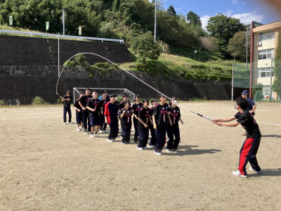 クラスごとで大縄跳びです。5分の練習後本番、5分間で跳んだ回数の合計で競います。